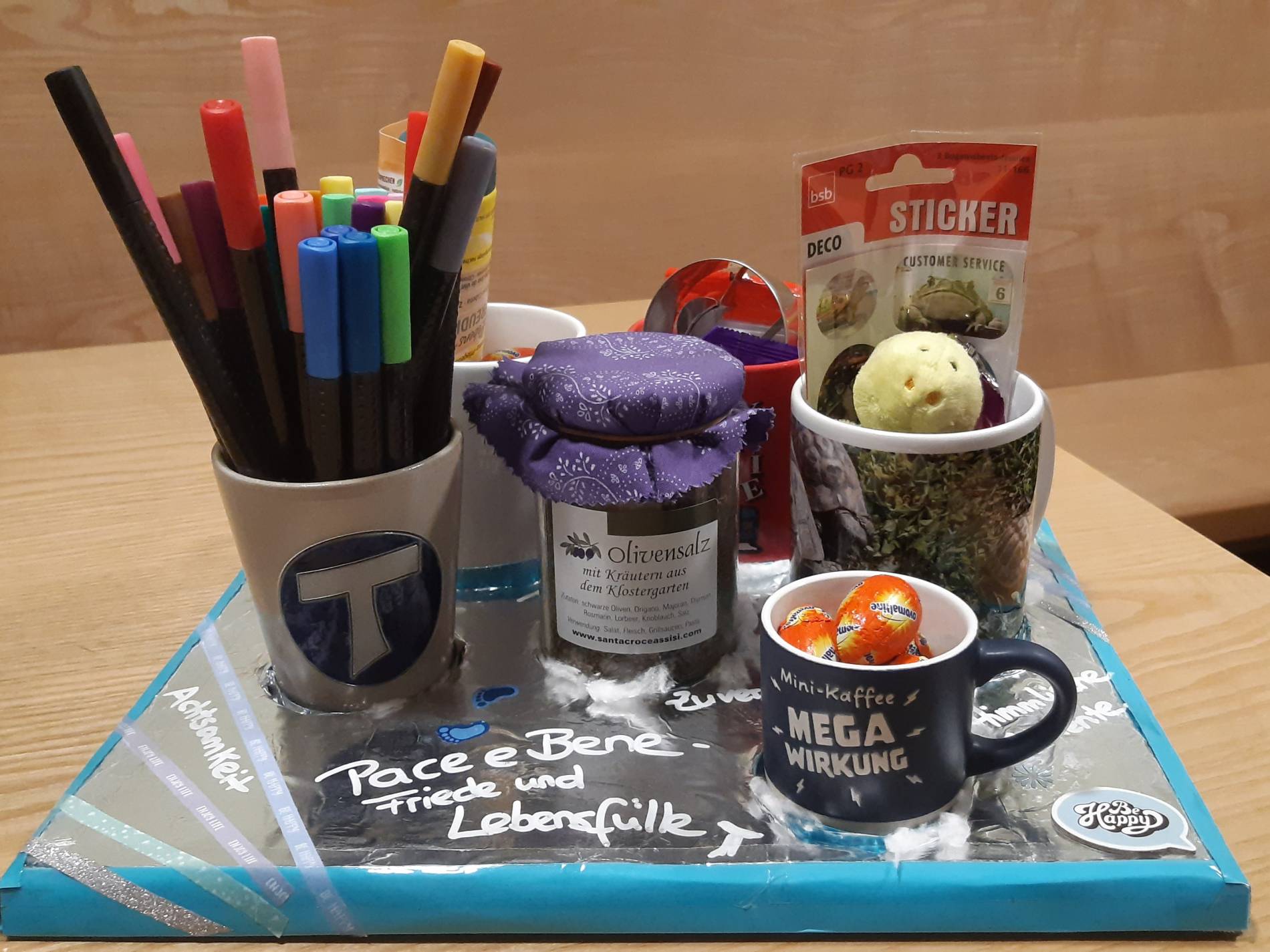 Am Ostersonntag verabschiedeten wir intern, bei der gemeinsamen Rekreation, Cindy aus der Lebensgemeinschaft. Als Erinnerung erhielt sie, in Anlehnung an das "Tassen-Sammelsurium" der Dispenz, verschiedene Tassen, die jeweils thematisch passend, auf Cindys Engagement und Vorlieben gefüllt waren.