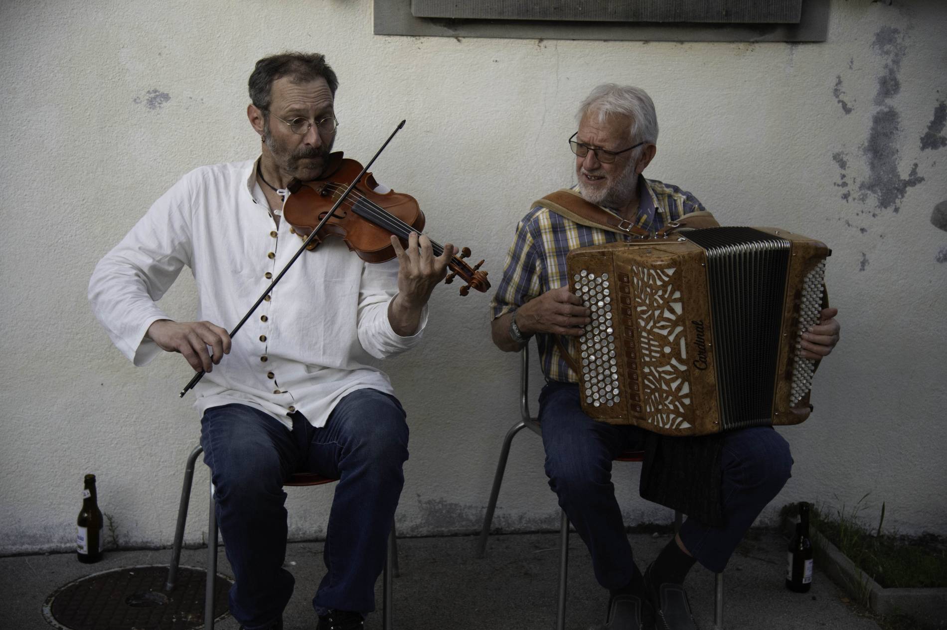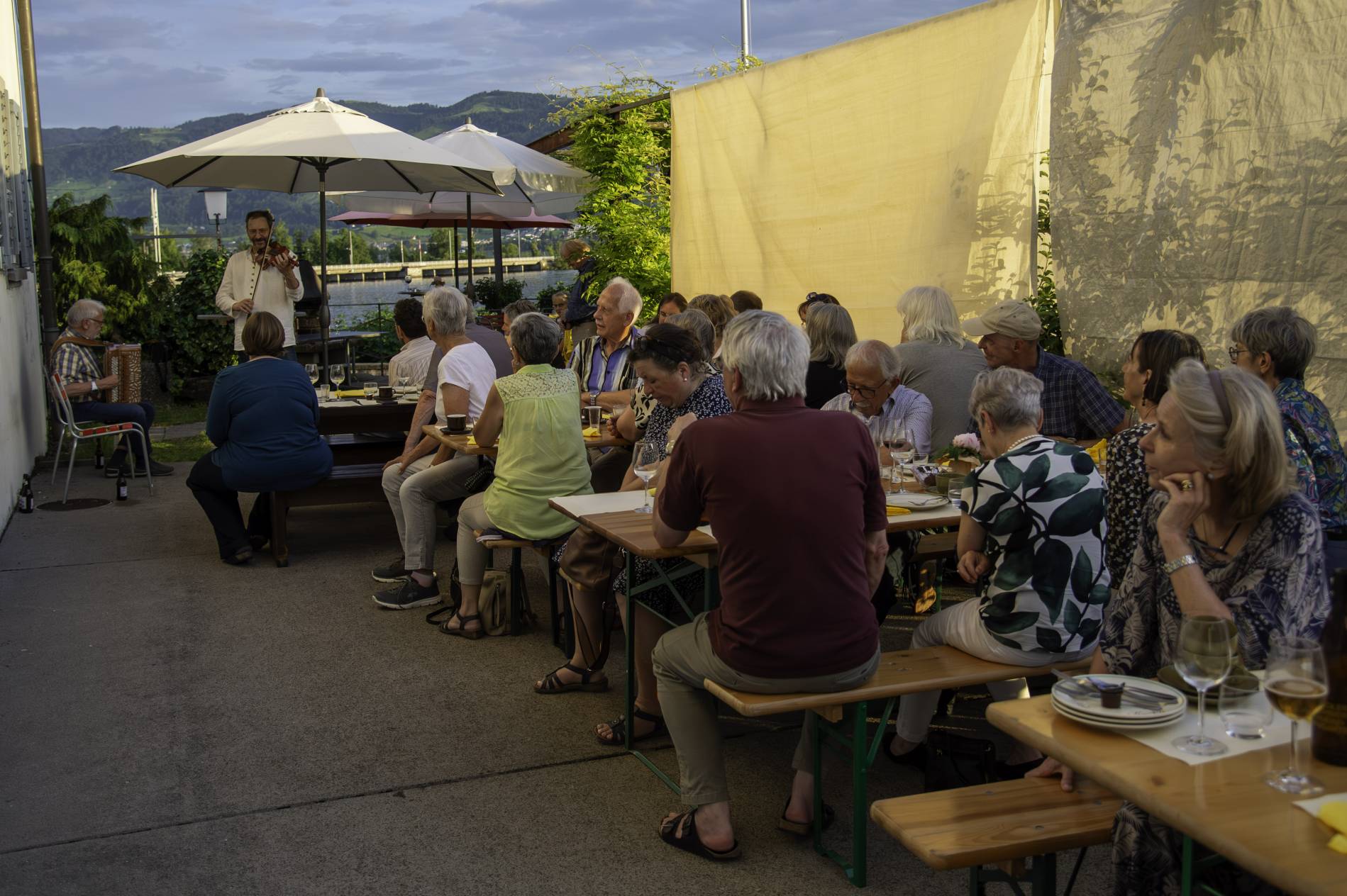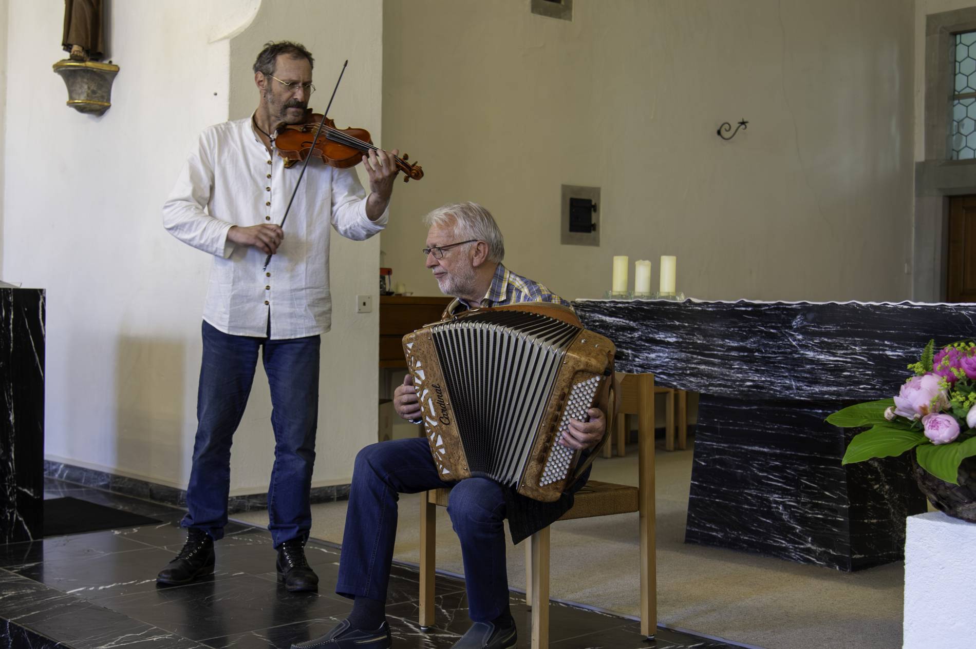 Doch Ordnung muss sein! Zuerst gehörte sich der geschäftliche Teil der jährlichen Mitgliederversammlung in der Klosterkirche. Der Vereinspräsident konnte dazu gegen 70 Frauen und Männer aus dem Freundeskreis begrüssen. Der geschäftliche Teil war angemessen kurz, die Traktanden einstimmig verabschiedet und mit Applaus verdankt. Der Guardian des Klosters, Br. Norbert, berichtete über die Ereignisse des vergangenen Jahres. In der Klostergemeinschaft leben und arbeiten inzwischen 8 Kapuziner-Brüder und zwei Frauen. Das Angebot zum Mitleben war sehr erfolgreich und zu über 90% ausgebucht. Mit herzlichen Worten verdankte Norbert dem Freundeskreis die wichtige ideelle und materielle Unterstützung. Darauf folgte das Highlight des Abends: Der bekannte Akkordeonist Willi Valotti spielte zusammen mit dem Rapperswiler Violinist Michael Bösch auf; beide aus der bekannten Volksmusikgruppe Alderbuebe. Mit anspruchsvoller Volksmusik beschloss das bekannte Duett die Mitgliederversammlung und leitete über zum gemütlichen Teil. Man versammelte sich zusammen mit der Klosterfamilie zum Apéro und ausführlichen Grillabend auf der Klosterterrasse, wobei das frohe Fest zwischenhinein immer wieder mit frohen Klängen der beiden Musiker bereichert wurde. Ein grosser Dank gebührt allen Mitgliedern des Freundeskreises, der inzwischen über 160 Mitglieder zählt; er ist ein wichtiger Freund geworden und zuverlässiger Partner des „Klosters zum Mitleben“.