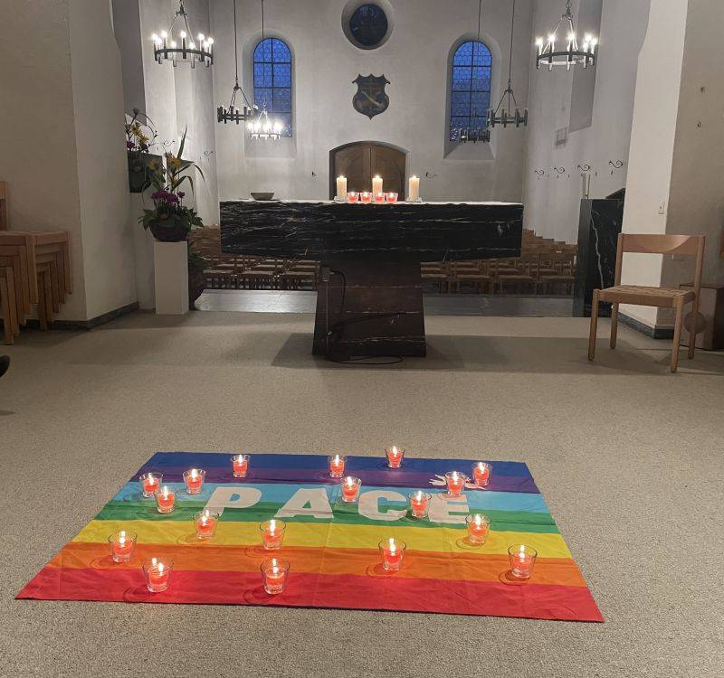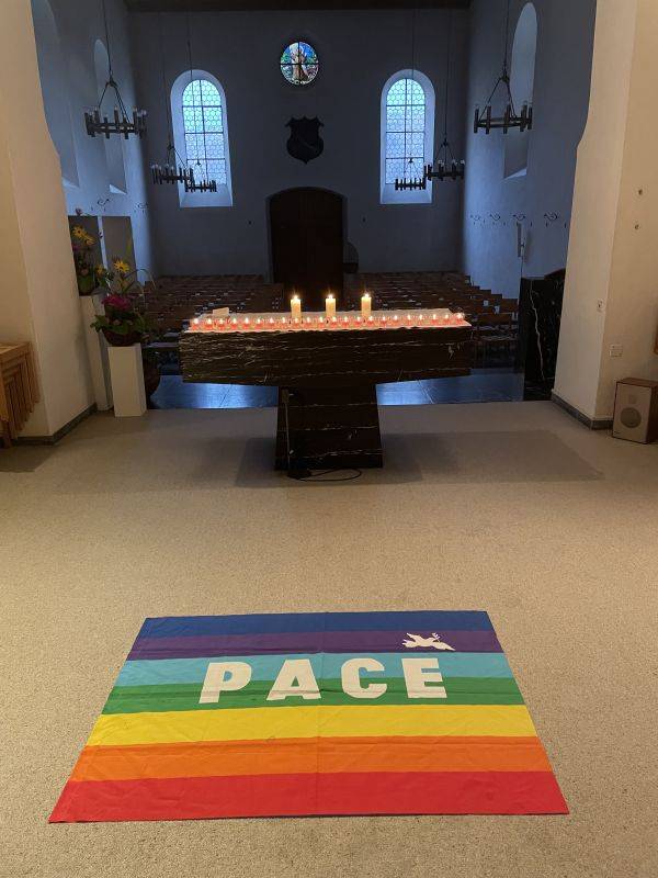 Jeden Donnerstag um 19.30 Uhr treffen sich die Gemeinschaft und Menschen aus der Umgebung in der Klosterkirche zum Innehalten und für den Frieden zu beten. Bei der letzten Feier stand das Symbol des Regenbogens im Vordergrund. Verschiedene Gebetsimpulse zu den einzelnen Farben luden zum Nachdenken und Verweilen ein. Ein Auszug daraus: